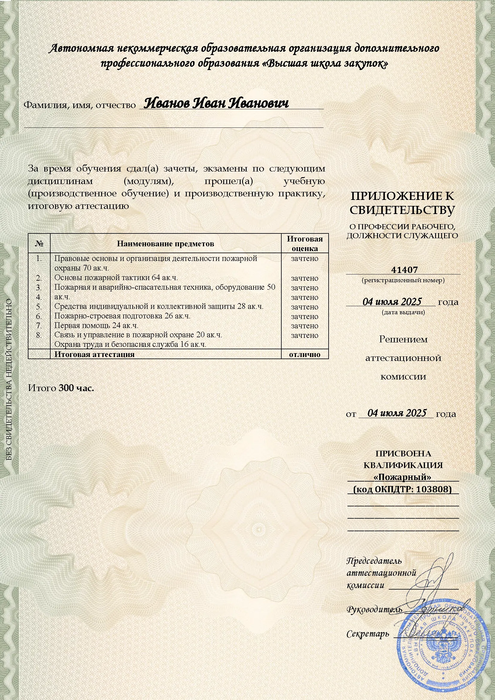 Профессиональное обучение, 300 академических часов, 8 модулей: законодательство и нормативные акты в области пожарной безопасности, тактика тушения пожаров и проведение аварийно-спасательных работ, устройство и использование пожарно-технического вооружения, оказание первой помощи. Онлайн-обучение в в Курске с итоговой аттестацией.