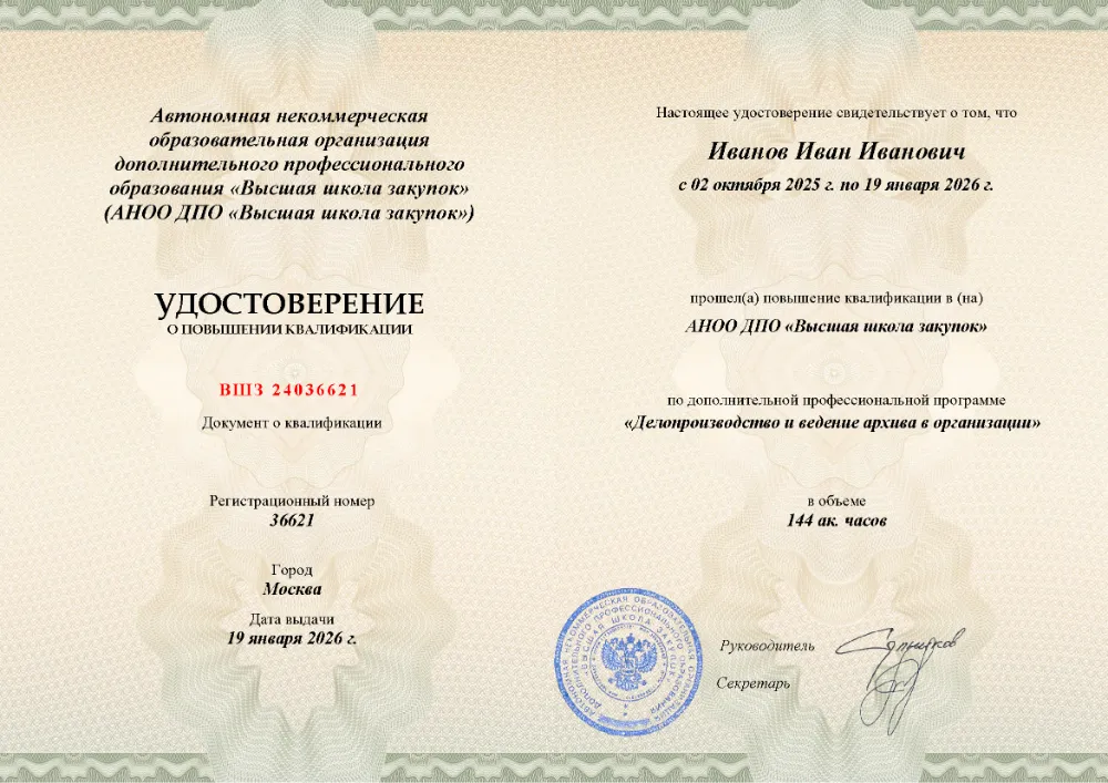 Программа повышения квалификации (144 часа) для специалистов по делопроизводству. Освойте ведение полного цикла документации и архива: от подготовки служебных и кадровых документов до работы с конфиденциальными материалами, международной перепиской и правилами хранения. Онлайн-обучение в в Курске с итоговой аттестацией.