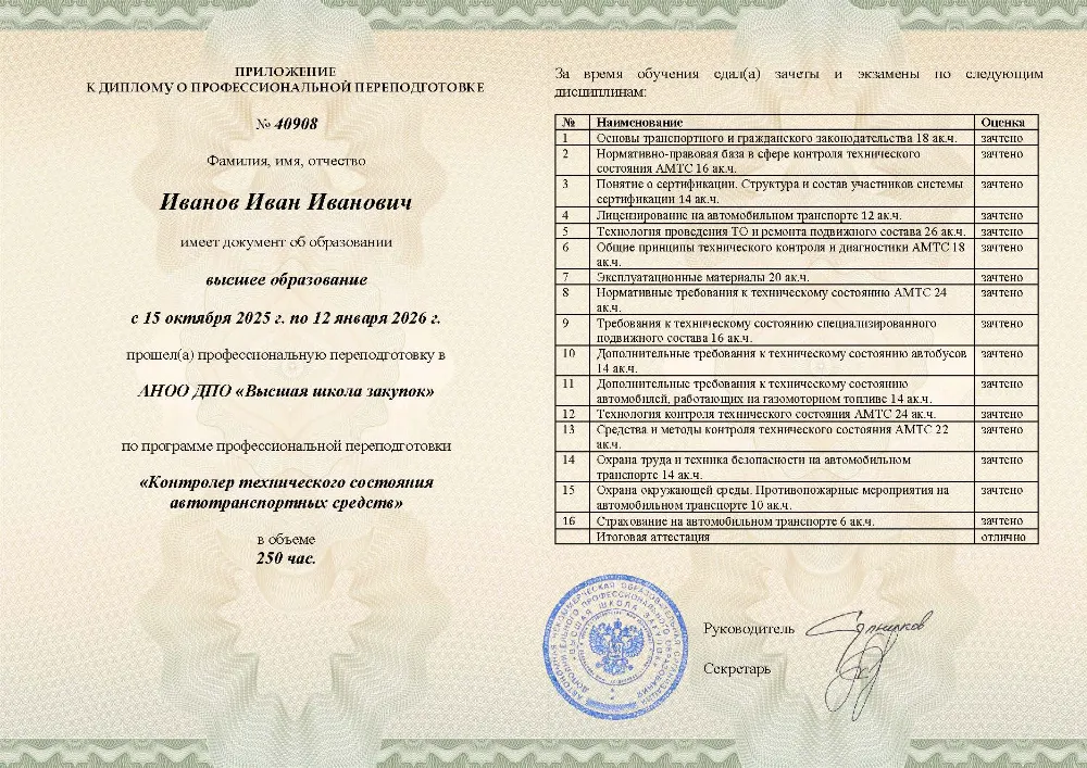 Профессиональная переподготовка, 250 академических часов, 7 модуля: нормативно-правовые основы и технологии контроля, охрана труда, экологии и требования к техническому состоянию транспортных средств. Онлайн-обучение в в Курске с итоговой аттестацией.
