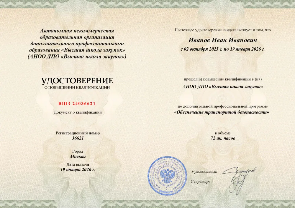 Повышение квалификации, 72 академических часа, 10 модулей: нормативная правовая база и система мер обеспечения транспортной безопасности, планирование и реализация защитных мероприятий, информационное обеспечение и государственный контроль, оценка состояния защищенности объектов. Онлайн-обучение в в Курске с итоговой аттестацией.